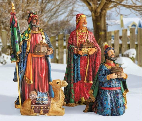 Three Kings: Melchior {48.03" Height x 22.05" Wide} , Balthazar {51.57" Height x 21.65" Wide}, and Caspar {37" Height x 24.40" Wide} * Stable {81 1/8" Height x 70 3/4" Wide}