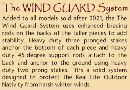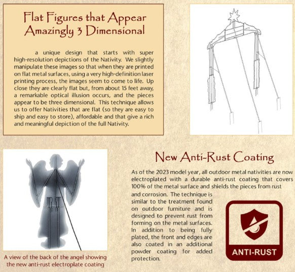 NEARLY LIFE SIZE AND REALISTIC DETAIL: Detail that captures the Nativity Story and brings it to life. The front is printed in UV, Sun-Resistant Paint. The back side is painted all white and has bracing rods that provide strength and stability.